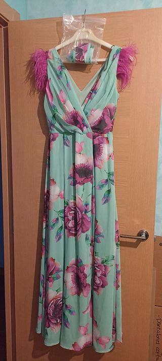 talla M, color aguamarina y fucsia, una sola puesta,con cinturón a juego y plumas en los hombros. •Largo desde el hombro 141 cm •De sisa a sisa, 44.5 cm •Cintura de trabilla a trabilla 40cm Precio original 130€