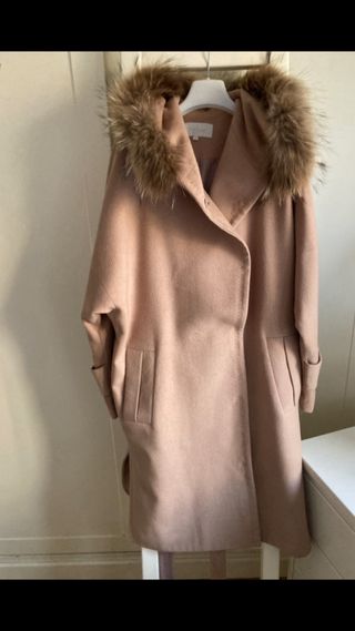 Abrigo de lana Eryn Brinié. Cuello capucha con pelo desmontable mediante botones. Manga larga con hombro caído. Bolsillos en delantero. Bajo con abertura en los laterales Cinturón lazada en mismo tejido. En muy buen estado, puesto en dos ocasiones