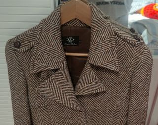 Abrigo largo con solapa, estampado de espiga en tonos marrones y beige, con pequeños toques naranjas. Detalle de cinturón y tiras con botón en los hombros. Talla 38 📦 Envío rapido