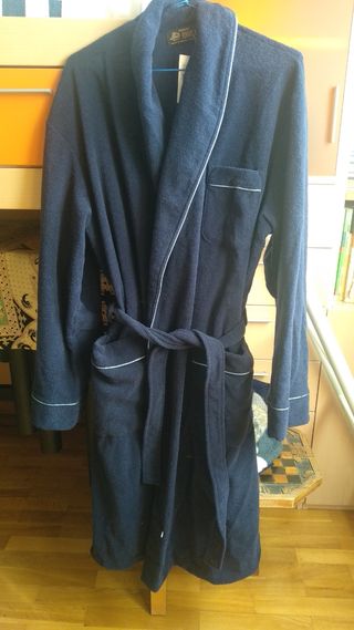 Elegante bata de caballero de felpa, perfecta para estar cómodo en casa. - calentita - Suave tejido de felpa. - Diseño clásico con cinturón. - Acabado con ribete blanco.