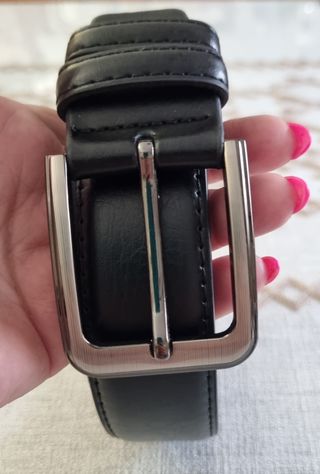 Elegante cinturón de cuero para hombre, perfecto para combinar con diferentes atuendos. Mide de largo 120 cm y de ancho 3,4 cm - Material: Cuero de vaca. - Hebilla metálica plateada.