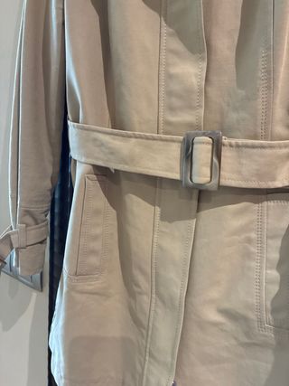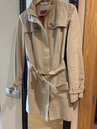Gabardina fina de color beige. - Diseño clásico con cinturón. - Cierre de botones. - Capa sobrepuesta en los hombros extraíble
