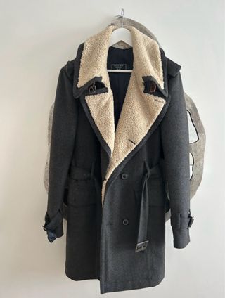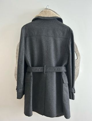 Abrigo gris de paño con cuello de borreguillo y forro interior. - Cierre cruzado con botones. - Cinturón a juego. - Puños ajustables con trabillas. - Bolsillos interiores - Cuello ajustable. - Trabillas decorativas en hombros.