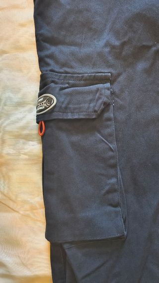 Pantalón de trabajo estilo cargo en color azul oscuro. Ajustes de velcro para cintura. Nuevo a estrenar. - Talla 46/48. - Dos bolsillos laterales. - Dos bolsillos cargo en los muslos con solapa. - Dos bolsillos traseros con solapa. - Trabillas para cinturón.
