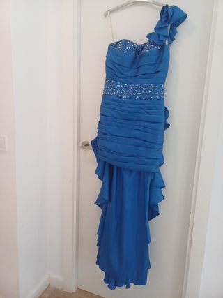 Elegante vestido de fiesta azul con detalles de pedrería. - Diseño de un solo hombro con volantes. - Cinturón adornado con perlas y cristales. - Falda con volantes y caída asimétrica.