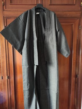 Prenda de Japón. Es de hombre, con estampado sobrio, ideal para alguien de una altura en torno a 175 cm. Corte holgado y cómodo. Incluye obi (cinturón) fácil de anudar