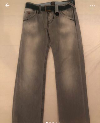 Pantalon vaquero de hombre y cinturon de la marca Energie. Color gris,talla 32. Tipo pata ancha. Muy poco uso,en excelentes condiciones. Medidas: Cintura 43 centimetros Largo de pierna 98 Precio negociable.
