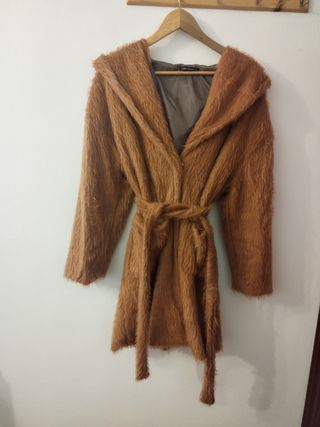 Abrigo de pelo marrón con cinturón y capucha