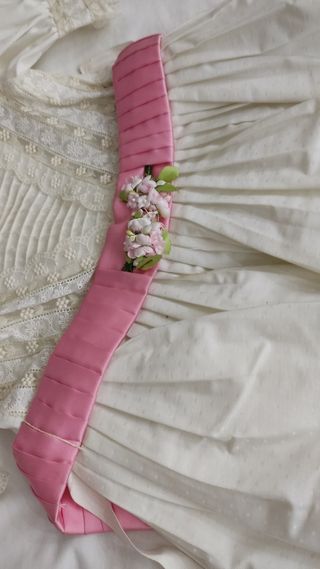 Precioso traje de comunión para niña, con detalles delicados y un diseño elegante. - Cuerpo con encaje y cuello volante. - Mangas abullonadas con detalle de puntilla. - Cinturón rosa con adornos florales. - Falda larga con puntilla y plisados en el bajo. Se guardo sucio y requiere limpieza, quizá tintoreria