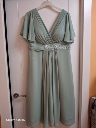 Elegante vestido midi, ideal para eventos. - Color verde agua. - Escote en V por delante y espalda. - Mangas acampanadas. - Cinturón decorado con pedrería y abalorios. - Falda con pliegues. - Medidas de hombro a bajo 118 cms. Ancho debajo del pecho 100 cms - Llevado un día. - Talla 42/44