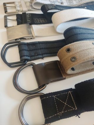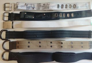 Cinturones Juveniles, varios colores, modelos y medidas, son todos de lona - Rojo 84 cm - Blanco roto 96 cm - Amarillo tricolor 105 cm - Burdeos 100cm - Gris cuadros 88 cm - Azul 107 cm - Azul Marino 93 cm - Marron con letras 90 cm Separados 1’50 euros y juntos 8 euros