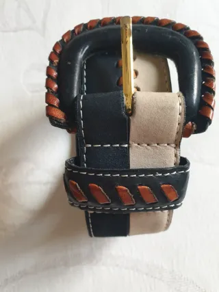 Elegante cinturón de mujer con un diseño único. - Combinación de materiales y colores. - Hebilla metálica dorada. - Costuras decorativas en contraste.