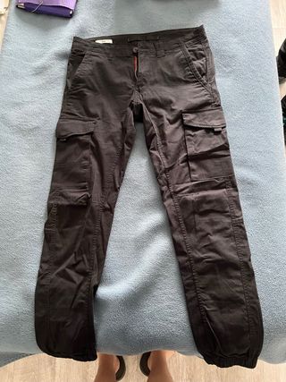 Pantalón cargo de la marca Jack & Jones en color negro. Diseño moderno y funcional. - Bolsillos laterales con solapa. - Cintura con trabillas para cinturón. - Cierre de cremallera y botón. - Bajo elástico.
