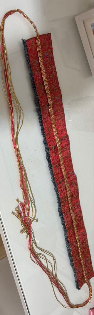 Cinturón de tela con un diseño trenzado y flecos decorativos. Es ajustable para adaptarse a diferentes tallas. - Tejido con estampado floral en tonos rojos y dorados. - Detalle de trenzado en la parte central. - Flecos largos en un extremo para un estilo bohemio.