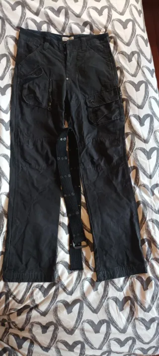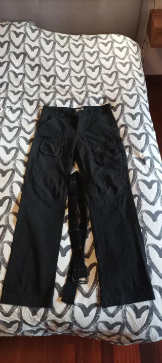 Pantalón largo de estilo cargo en color negro. Incluye un cinturón a juego. - Diseño con múltiples bolsillos. - Cierre de cremallera y botón. - Cinturón de tela con hebilla metálica.