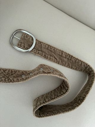 Cinturón de estilo vaquero con un diseño moderno y versátil. - Hebilla metálica ovalada en tono plateado. - Correa de tela con textura desgastada. - Múltiples ojales para ajuste.