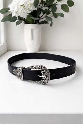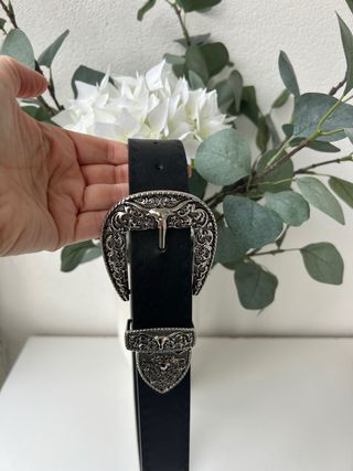 Cinturón negro con hebilla plateada grabada – 95 cm. Cinturón negro con hebilla plateada grabada – 95 cm Cinturón negro de estilo western con hebilla plateada ornamentada y pieza metálica en la punta. Diseño elegante y con personalidad, ideal para llevar con vestidos, jeans o looks más sofisticados. La hebilla tiene un grabado muy bonito de estilo vintage que lo hace especial. Medida: 95 cm desde la punta hasta la hebilla (sin contar la hebilla). En muy buen estado. Perfecto para dar un toque elegante a cualquier conjunto.