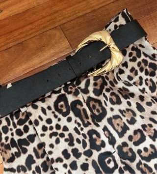 Pantalón palazzo con estampado de leopardo y cinturón. - Diseño ancho y fluido. - Cinturón negro con hebilla dorada.