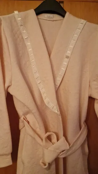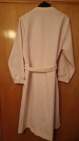 Elegante bata de mujer en un suave tono rosa palo. Perfecta para estar cómoda en casa. - Tejido con relieve floral. - Cinturón para ajustar. - Manga larga. - 54cm ancho y 109cm largo