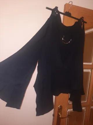 Elegante blusa negra con un diseño moderno y detalles únicos. - Incluye cinturón a juego. - Mangas amplias y escote llamativo.
