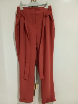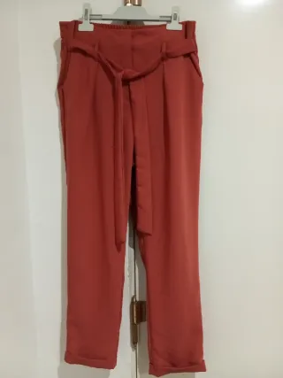 Pantalón formal negro Detalle: Pantalón confeccionado en hilatura con mezcla de algodón. Tiro medio y cintura con trabilla. Cierre frontal con cremallera, botón y gancho metálico. Incluye cinturón ajustable. Composición: (tela de buena calidad, suave y firme) Exterior: 58% algodón y 42% poliéster; Forro: 100% poliéster. Talla: XS (las medidas detalladas en cm están en la foto) Pantalón valorado en 35,99€