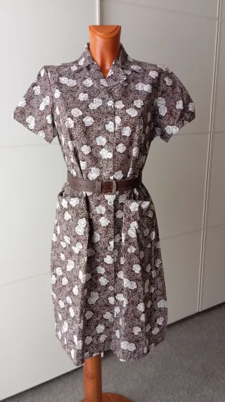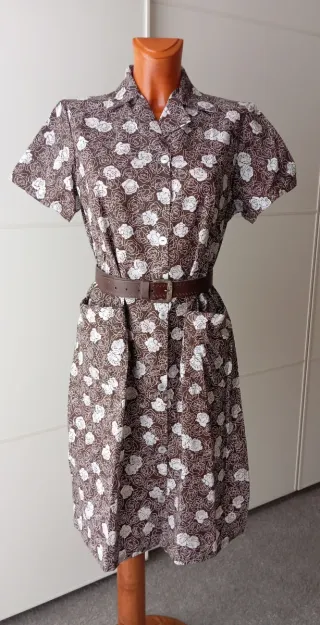 Vintage vintage. Delantal vintage color marrón con flores en blanco. Nuevo a estrenar. Botones delanteros y 2 bolsillos. Manga corta. Cinturón no incluido. Talla 38 aproximadamente. El maniquí es una talla 38. Sí tienes dudas consulta las medidas. ✨💗 MEDIDAS 💗✨ Largo 99 cm Sisa, ancho de axila a axila 52 cm Hombro a hombro 40cm Cintura 47cm Cadera 53 cm