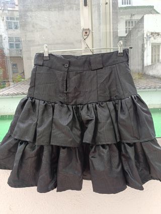 Falda corta negra con un lacito en el medio. No pone talla. Tiene para cinturón. Es de polyester. Medidas aproximadas: Ancho: 33-34 cm Largo: 47-48 cm