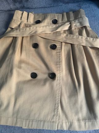 Falda de Bershka en color beige, con cinturón y botones. Mucha ropa misma talla. Ancho cintura 32 cm. Largo 39 cm sin cintar rl adirno encima de botones superiores - Diseño con cinturón de tela. - Cierre de botones. - Estilo tipo gabardina.