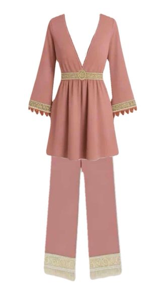 Conjunto de dos piezas estilo Dubai. - Top con escote en V y cinturón dorado. - Mangas acampanadas con detalle de flecos. - Pantalón ancho con borde decorado. - Viene sin el cinturón