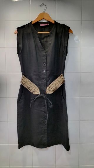 Vestido negro de verano, abotonado y con un original cinturón bordado. Está como nuevo, apenas usado. Más ropa en mi perfil, puedo hacer lote con cualquier otro artículo.