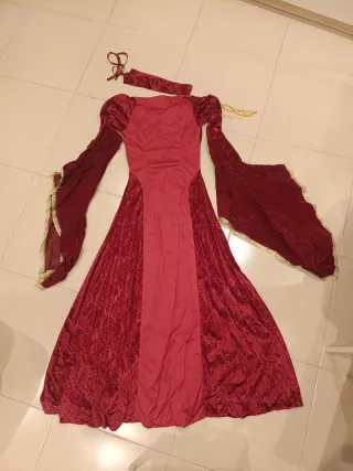 Este disfraz de cortesana está hecho de terciopelo con detalles bordados dorados. De la nuca al final de la falda hace un 1.40 metros - Tejido principal de terciopelo. - Mangas largas con puños dorados. - Adorno bordado en el escote. - Incluye cinturón a juego y collar.