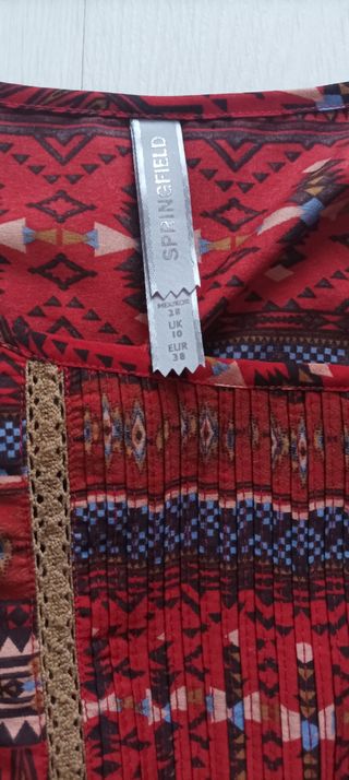 Vestido estampado de Springfield con manga corte francesas. Tiene bordados en la parte delantera y un cinturón de la misma tela.
