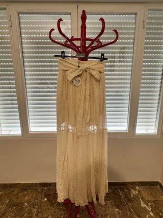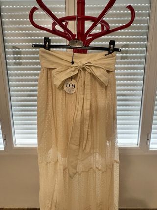 Falda vintage en beige, con gasa y bordado hecha a mano, y forro interior corto. Talla S. Cierre en cremallera. Cinturón largo para hacer nudo o lazo. Super elegante, bonita y para estrenar. Largo: 1’10cm Cintura 31cm