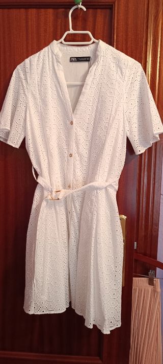 Precioso vestido blanco de Zara, sin estrenar. Es de algodón, con bordados calados y un cinturón. - Escote en pico. - Manga corta. - Cierre de botones. - Perfecto para eventos especiales o para el día a día.