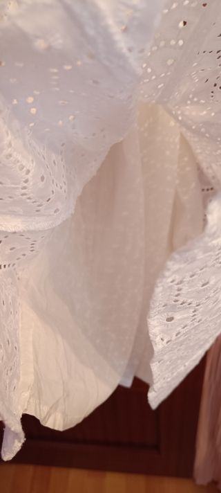 Conjunto de dos piezas. Falda y corpiño, usado solo una vez como vestido de boda. La falda con bordado y el corpiño con volante en el cuello Largo de cinturón 80cm Largo de falda 1'05cm Contorno de pecho 50cm
