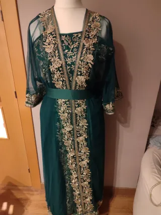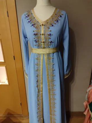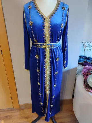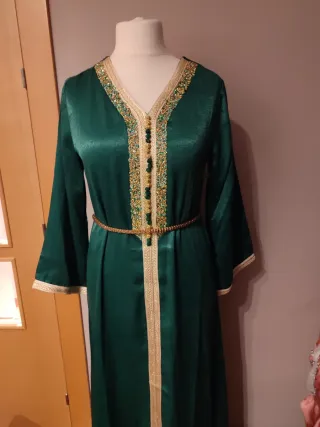 Elegante kaftán árabe con detalles bordados. - Diseño largo y fluido. - Adornado con pedrería y bordados dorados. - Cinturón a juego incluido. Tengo varios, preguntame si te interesa alguno, son talla S-M