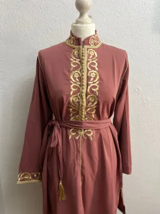 Elegante caftán marroquí con detalles bordados y cinturón. Incluye cinturón. No hago devoluciones de caftanes ya que muchas veces lo compran para ponérselo, lo llenan de manchas y me lo devuelven. - Diseño tradicional con bordados intrincados. - Cinturón a contraste para marcar la silueta. - Confeccionado en tejido ligero y fluido.