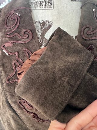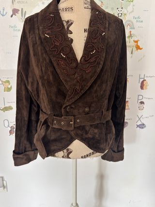 Chaqueta de ante marrón, probablemente de estilo vintage de los años 70, que presenta un cinturón a juego y un detalle de bordado en las solapas. El estilo con cinturón era popular en la moda femenina de esa década. Material: Confeccionada en ante (un tipo de cuero suave y flexible) de color marrón oscuro. Diseño: Cuenta con un cuello tipo solapa ancho y un cierre frontal cruzado con dos botones. Adornos: Destacan los elaborados bordados o apliques de cordón marrón en las solapas y parte del cuello. Ajuste: Incluye un cinturón de ante con hebilla que ayuda a definir la silueta, típico de las prendas de abrigo de esa época.