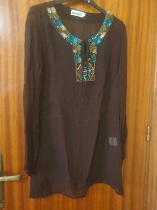 Precioso vestido largo de estilo italiano. Es de color marrón y tiene un bonito bordado blanco. - Diseño de manga larga. - Cierre de botones. - Incluye cinturón. - Tallas: S - M - L - XL - XXL