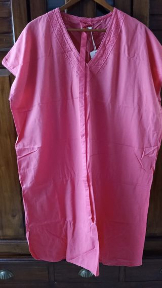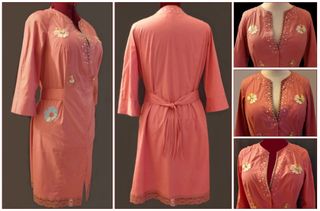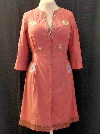 Vestido rosa palo Romanetti, talla L (40/12). Composición: 97% algodón y 3% elástico/spandex. Modelo de cuerpo entero con estampado floral bordado y cuello bordeado con abalorios (pedrería y lentejuelas), mangas 3/4 ribeteadas de hilo a ganchillo y bajo vestido con encaje del mismo color. El vestido, sin corte delantero ni trasero, se abrocha delante con broches forrados de la misma tela (ver detalles). Se ajusta con cinturón anudado a la espalda (terminado en cintas). En perfecto estado, como nuevo, puesto varias veces nada más. Nota: envío no incluido en el precio.