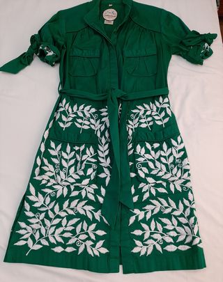 Precioso vestido de entretiempo en color marrón oscuro, talla XL (42/14). Tiene un diseño único con flores bordadas en tonos verdes azulados. La tela parece de algodón, suave y cómoda. Luce impecable, ideal para cualquier ocasión. - Cierre de botones. - Manga larga. - Detalle de cinturón.