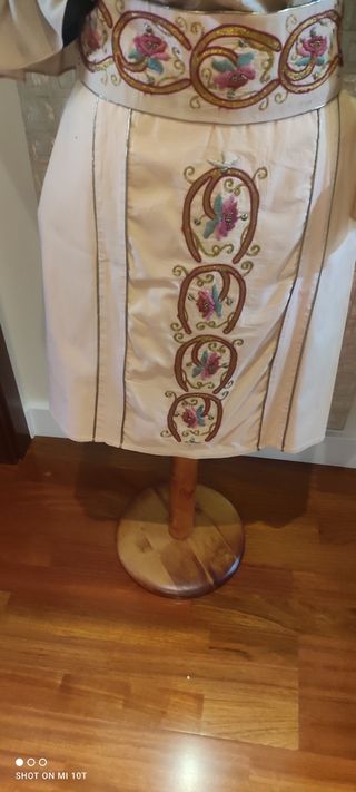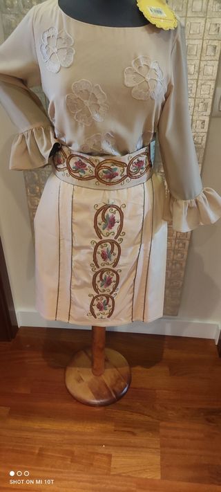 precioso conjunto de falda, blusa y cinturón bordado, sin estrenar, talla L. color rosa empolvado.
