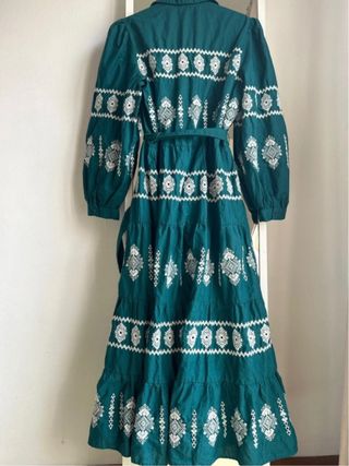 Vestido midi en color verde oscuro con detalle de bordados perforados en color blanco y cinturon a juego. es monisimo. ideal para la temporada de #boda #bautizo #comunion . es la talla S pero talla amplia. nuevo sin estrenar. costaba 69,95€