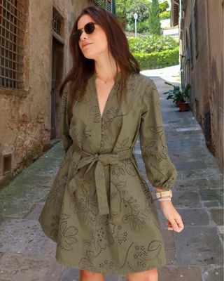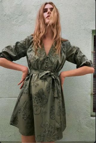 Vestido corto color caqui, corte suelto con cintura ajustable con lazada, detalle de botones forrados, con bordados a tono y perforados. - Escote en V. - Manga tres cuartos. - Cinturón en el mismo tejido.