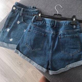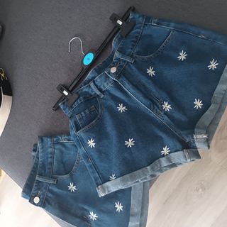 Shorts vaqueros de corte moderno con un encantador bordado de margaritas. - Diseño de cinco bolsillos. - Cintura con trabillas para cinturón. - Dobladillo enrollado en las perneras.