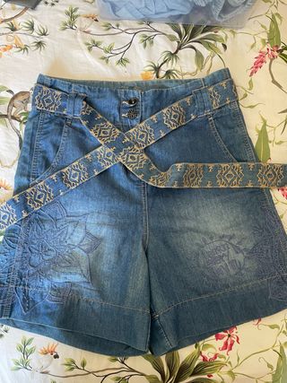Shorts de tencel con un diseño único y llamativo. - Cinturón con estampado geométrico. - Bordados florales en los bajos. - Detalle de texto bordado en la pernera derecha.
