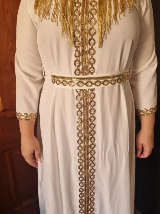 Elegante vestido blanco largo con adornos dorados. - Escote en V con flecos dorados. - Cinturón a juego con detalles. - Puños adornados con bordado dorado. - Largo hasta los tobillos.