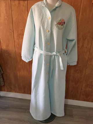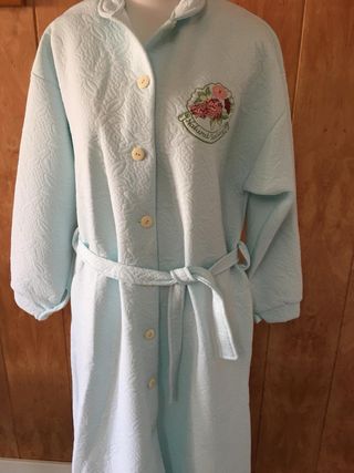 Bata de señora con un suave tejido acolchado y estampado floral. -Mide de sisa a sisa 52 cm y de largo 127 cm. - Cierre de botones. - Cinturón para ajustar. - Cuello clásico. - Detalle bordado en el pecho.