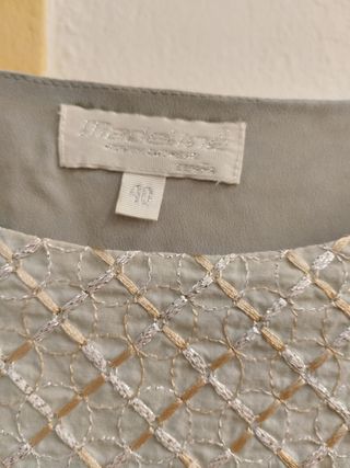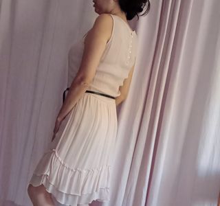 Vestido color rosa palo tipo gasa, cinturón incluido, caída vaporosa con volante final, bordados en el pecho, tiene forro, puesto un par de veces. Pone talla L pero es más una M, aproximadamente 45 cm entre sisas.