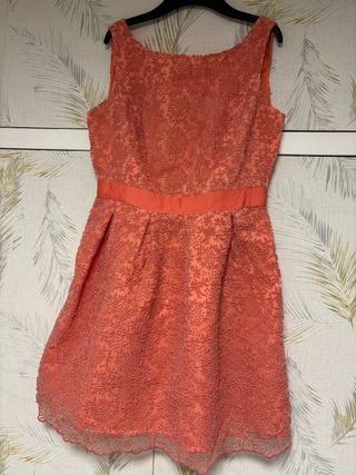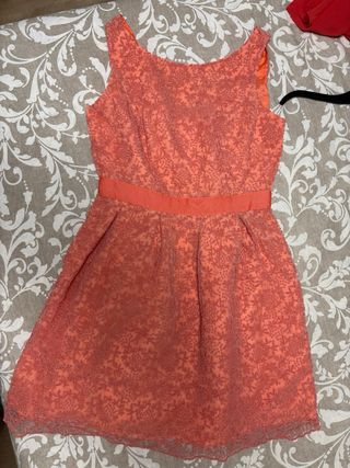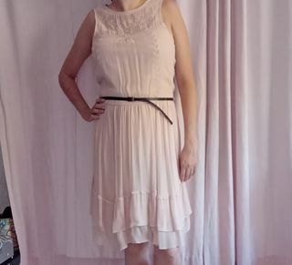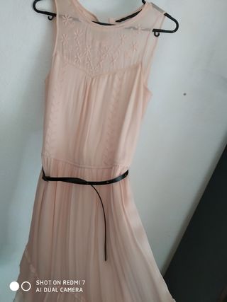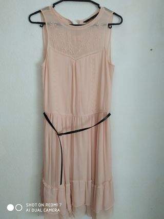 Vestido de estilo romántico con detalle de encaje y bordados en color rosa palo. Tiene forro, longitud midi, incluye cinturón. Pone talla L ( Trafaluc) , es más conveniente una M